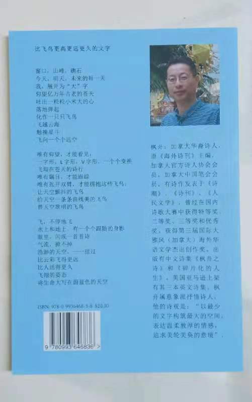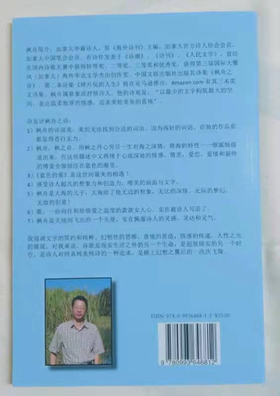 加拿大华裔诗人,原《海外诗刊》主编,加拿大官方诗人协会会员,多伦多诗友会会长,多伦多英诗读书会会长,有诗作发表于《诗潮》、《诗刊》、《人民文学》、《创世纪》等刊物,在诗歌大赛中多次获得特等奖、二等奖、三等奖、优秀奖等,获第三届国际大雅风(加拿大)海外华语文学杰出创作奖。出版有中文诗集四本《枫舟之诗》、《碎片化的人生》、《河流上的波光》、《灵魂的归来》。美国亚马逊上有其三本英文诗集。枫舟属意象派抒情诗人,他的诗观是:“以最少的文字构筑最大的空间,追求美轮美奂的意境,展现爱的情怀和人性的光辉”。
